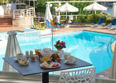 The Paradise Hotel was built in 1988, it has 31 double or twin bedded rooms with private toilet facilities, balcony (most with sea view) telephone, safety deposit box, fridge, air conditioning and hairdryer. The hotel has a reception, outdoor terraced breakfast area, lounge, swimming pool, childrens swimming pool, outdoor pool bar and an extensive lounging area reaching down to the sea. Perfect to put your feet up and relax under the shade of the pine trees.Breakfast is buffet style and is served under the covered terrace, overlooking the swimming pool and the sea.