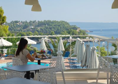 The Paradise Hotel is situated in Patitiri, just a five minute walk from the port and centre of town. An idyllic location because you feel that you aren’t really in the main town but out in the countryside but are really only minutes away from all the bars, tavernas and shops. It is only 50m away from the sea, perched above the cliff like rocks which are ideal for swimming, snorkeling, sunbathing and diving.